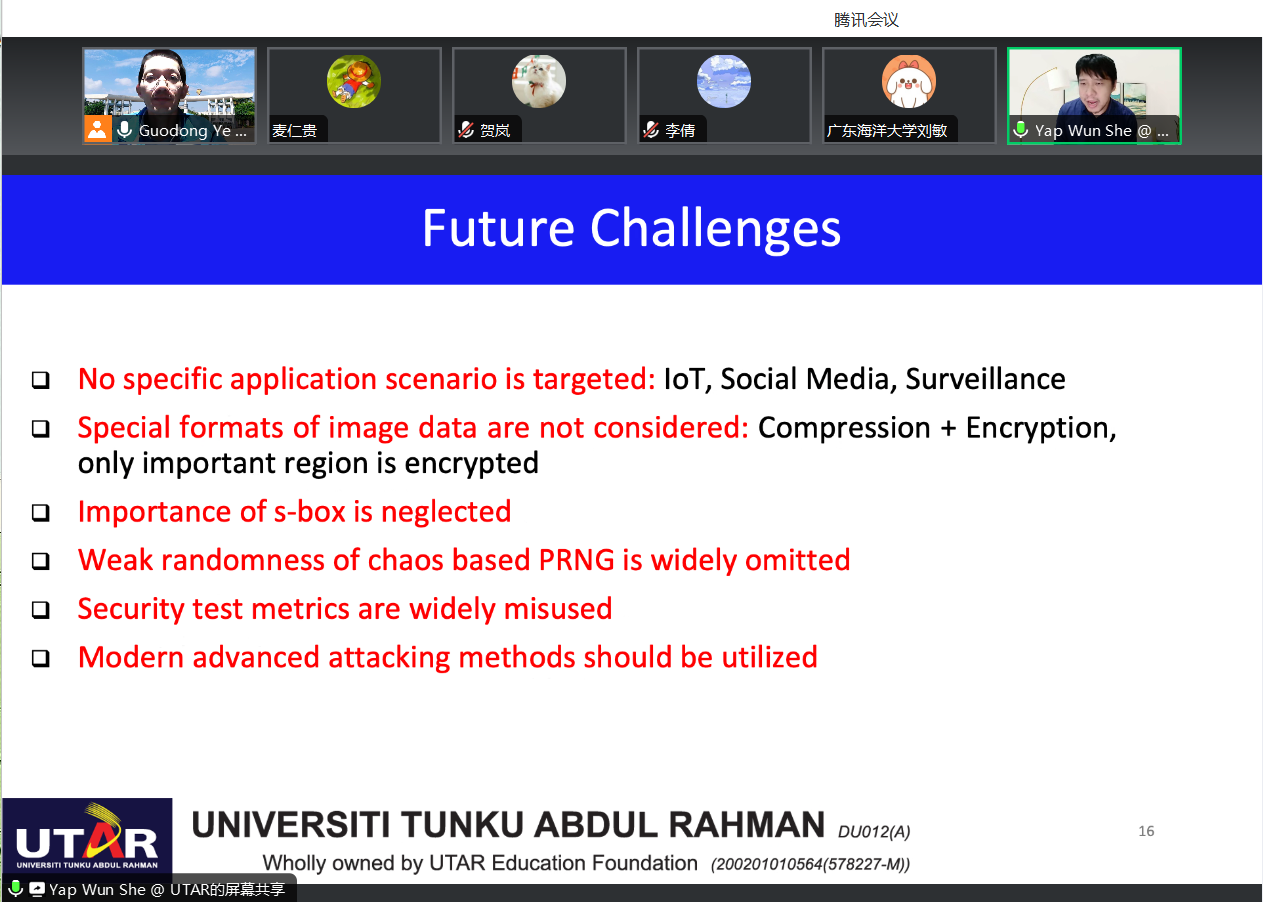 12月16日下午,应公司邀请,马来西亚拉曼大学经理Wun-She Yap博士以《Chaos-based cryptosystems: Basic Requirements and Lessons Learnt》为题,为公司师生作了一场线上学术报告,20多名师生在线聆听了报告。