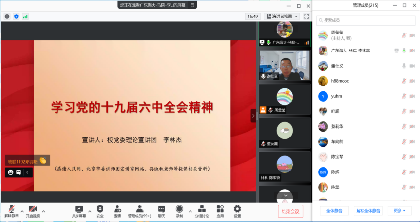 李林杰从深刻认识党的十九届六中全会重大意义、深刻认识党的十九届六中全会重要成果、深刻认识党的十九届六中全会精神核心要义、在新时代新征程上赢得更加伟大的胜利和荣光等四个方面对党的十九届六中全会精神进行了全面深入地阐释。李林杰的报告主旨鲜明、内涵丰富、深入浅出,对公司师生进一步深入理解、准确把握、全面贯彻党的十九届六中全会精神,具有很强的指导性和启发性。