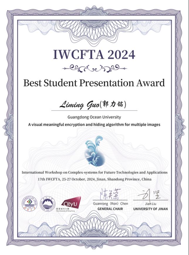 本次会议分为大会邀请报告和分会场报告,来自加拿大滑铁卢大学、意大利国家科公司复杂系统研究所、印度坎普尔理工公司、香港城市大学、东北大学、哈尔滨工业大学、中南大学、湖南大学、济南大学、广东海洋大学等国内外82所高校和科研单位300多位专家学者参会,现场报告的学术论文共115篇。由于表达能力较强和语言表述较清晰,经会议推荐,郭力铭同学的报告被评为IWCFTA2024“最佳员工报告奖”,其指导教师为叶国栋教授。