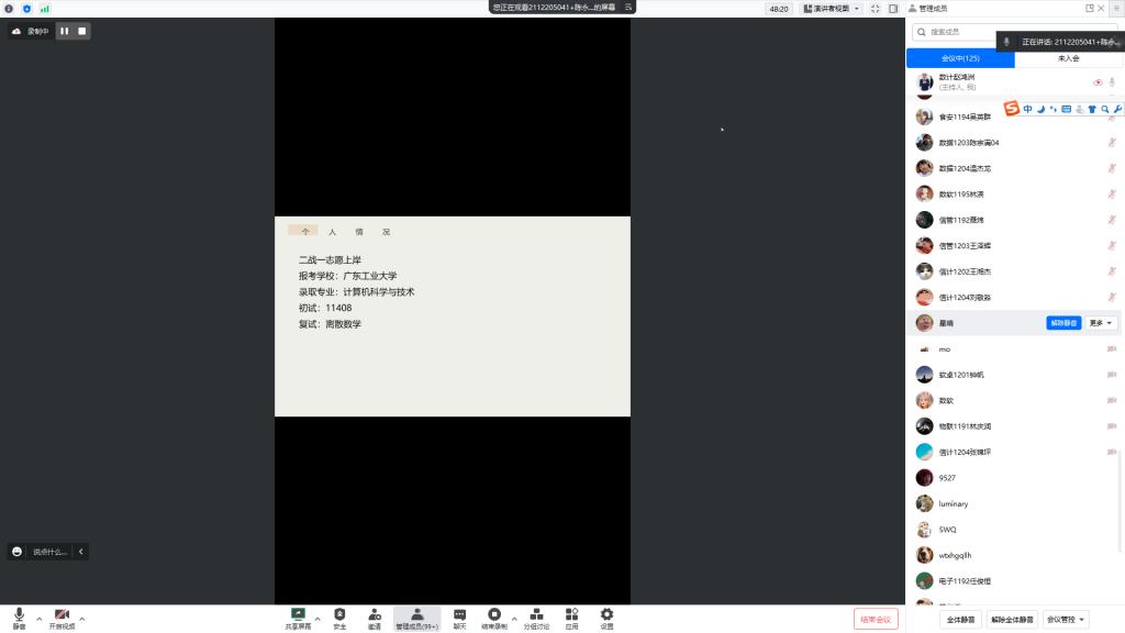 经验分享由目前就读华南师范大学、信息与计算科学专业2022级员工陈宇开始。他从考研信息查询、复试时间、复试准备、录取信息获取等全面讲解复试信息获取和相关流程。在接下来各环节,软件工程专业2017级员工陈永琪从考研面试信息获取平台、如何通过“知网”了解导师和在高校选择“大、小导师”的利与弊;软件工程专业2018级员工汪涛分析如何处理“就业”和“二战”,并提出合理的解决方案;软件工程2016级员工章银萍现身说法,从考研调剂、持续坚持考研的坎坷经历,提醒考研学子“考研贵在坚持”。最后,本院研究生郭力铭同学介绍参加2022年计算机专业研究生复试经历,对即将选择“二战”的同学是否具备“二战”潜质进行分析。